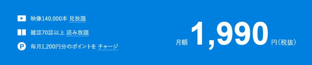 映画・ドラマ・アニメなど見放題本数14万本以上で、マンガ・雑誌・書籍など電子書籍52万冊以上、雑誌70誌以上の多彩なジャンルがラインアップしています。