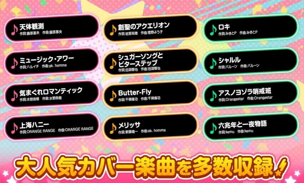 収録曲は、オリジナル曲に合わせてJ-POP・アニソンなど、大人気カバー楽曲も多数収録されています。