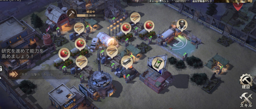 本部施設レベルによって開放される施設があり、建設時に必要な資材を得れる施設もあります。